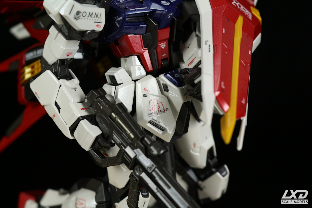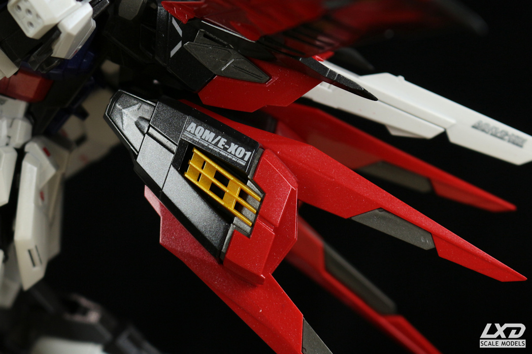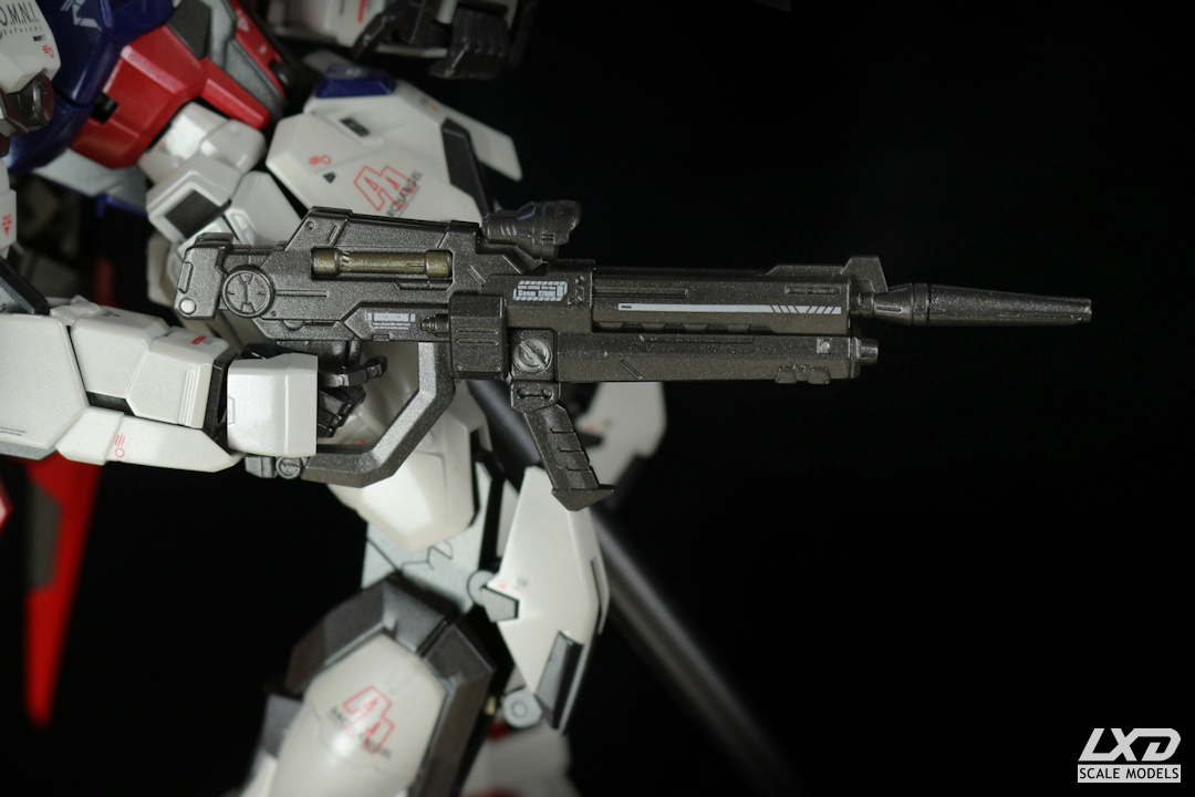 Aile Strike Gundam aus der Anime-Serie "Mobile Suit Gundam SEED" bildete den Auftakt zu einem besonderen Vorhaben: Gundams mit Metallic-Glanzlackierung. Insgesamt drei Mobile Suits habe ich auf diese Weise lackiert (die anderen beiden sind Freedom Gundam und Justice Gundam). Hierfür verwendete ich zum ersten Mal Lacquer Paints, die aufgrund ihrer überragenden Eigenschaften inzwischen zu meinen Standard-Sprühlacken geworden sind. Bei der Farbgebung orientierte ich mich an den Original-Farbtönen, nur eben mit Metallic-Effekt.