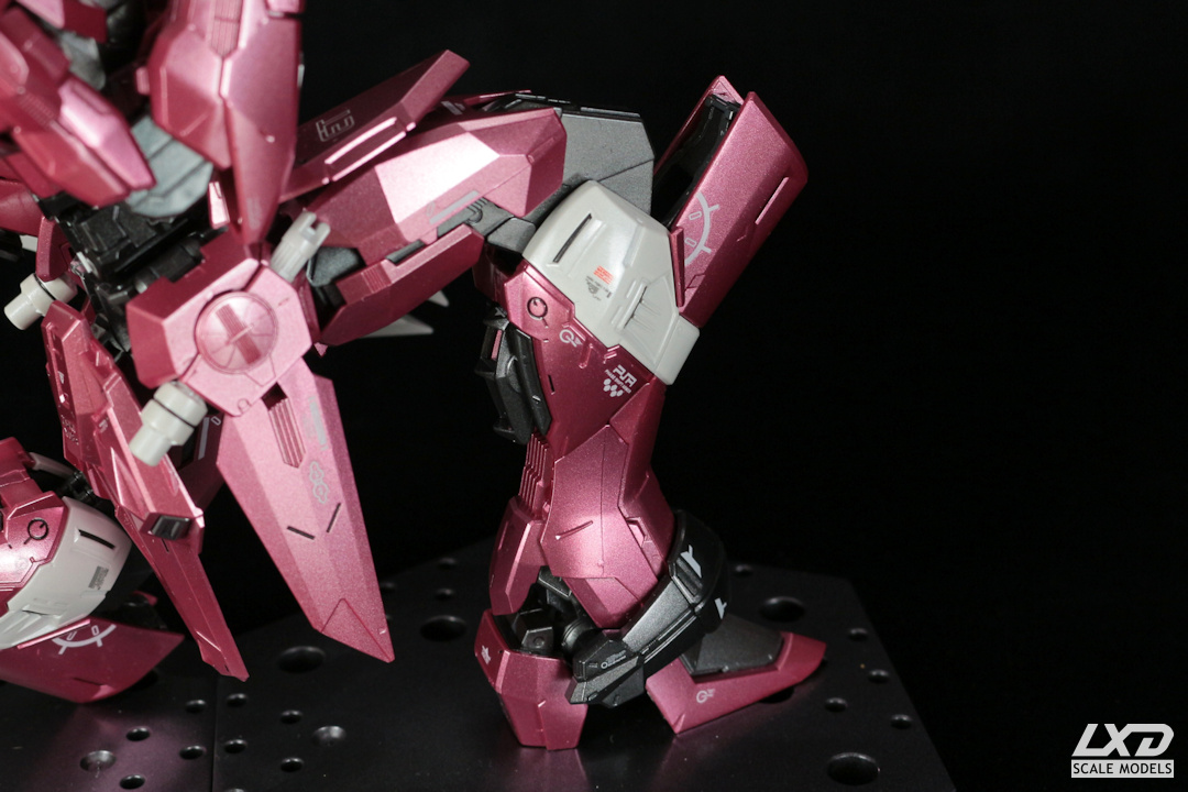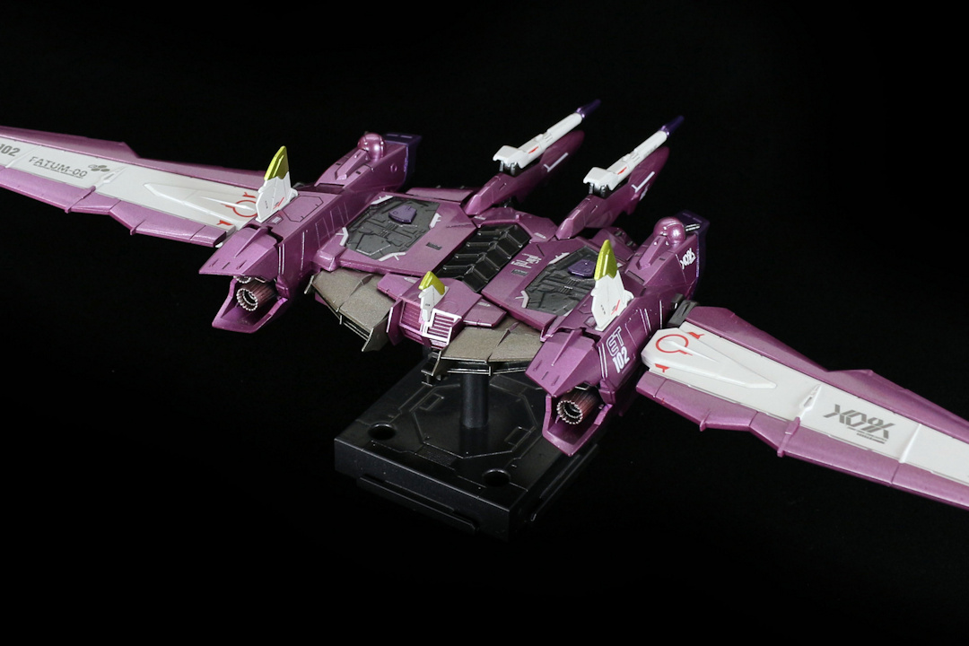 Justice Gundam (aus "Mobile Suit Gundam SEED") ist der letzte des Dreigestirns aus metallic-lackierten Gundams. Der Metallic-Effekt kommt bei den Magenta- und Violett-Tönen von Justice besonders gut zur Geltung. Fatum-00, der Carrier von Justice, den der Gundam normalerweise zusammengeklappt auf seinem Rücken trägt, habe ich als eigenständiges Modell dargestellt.