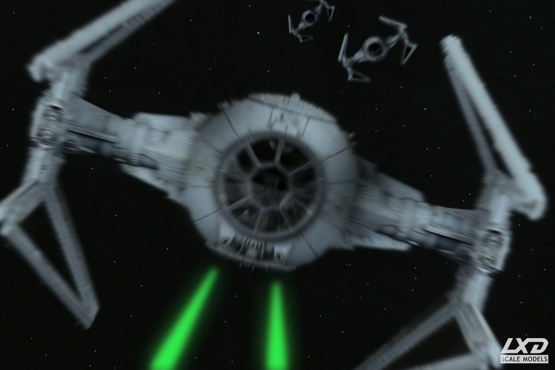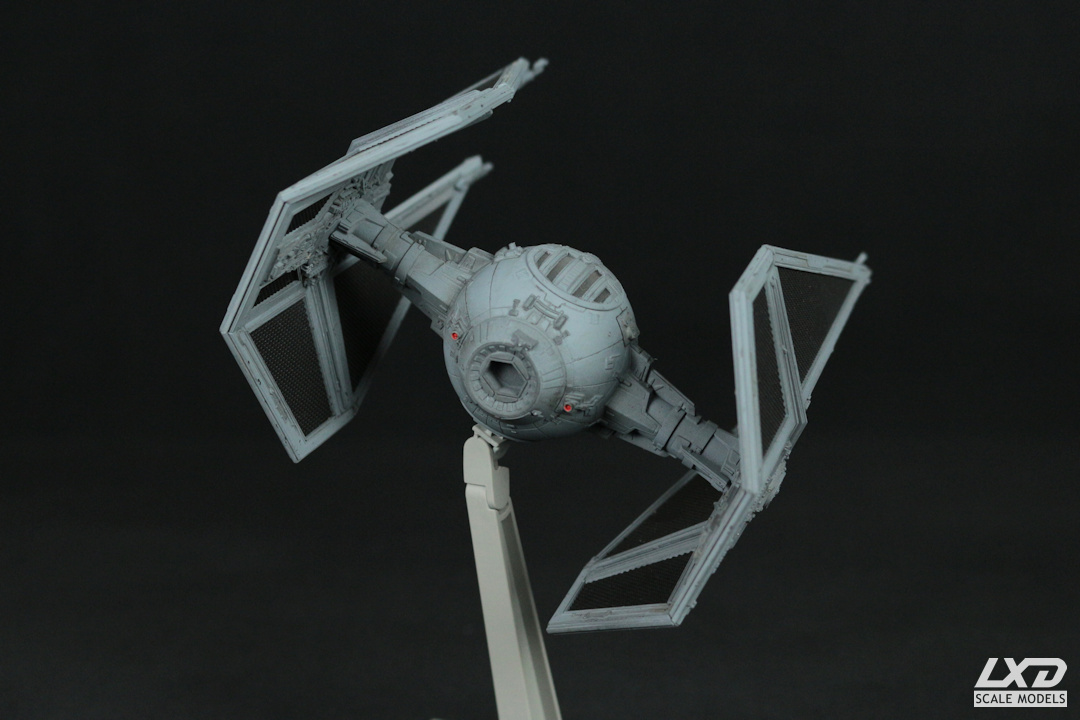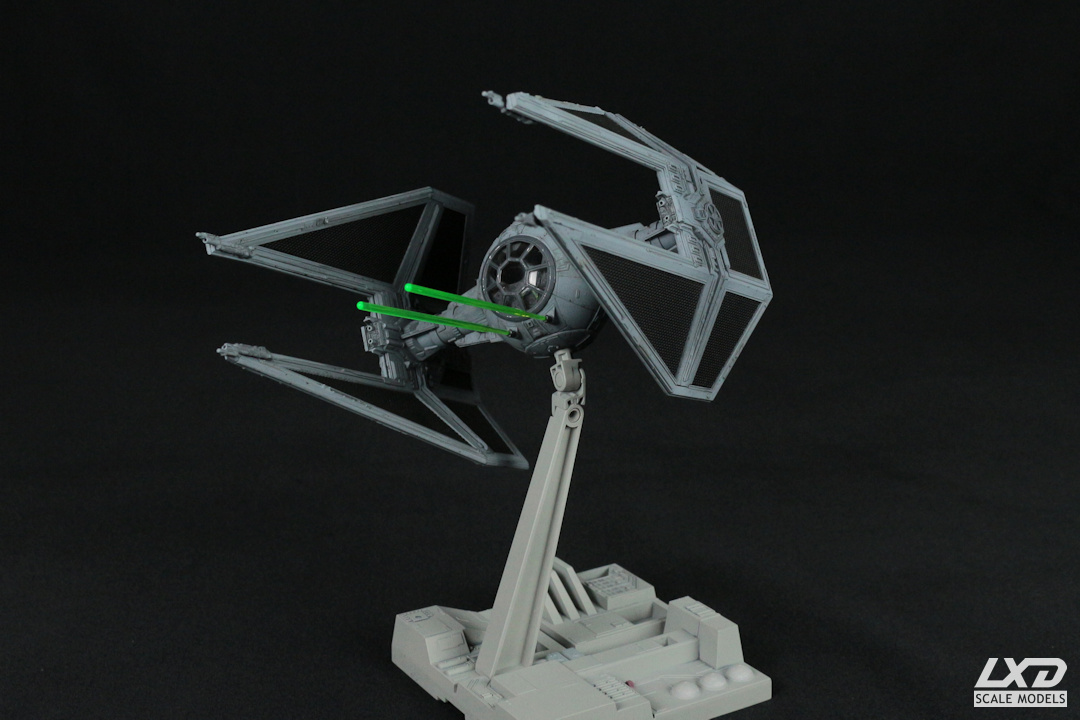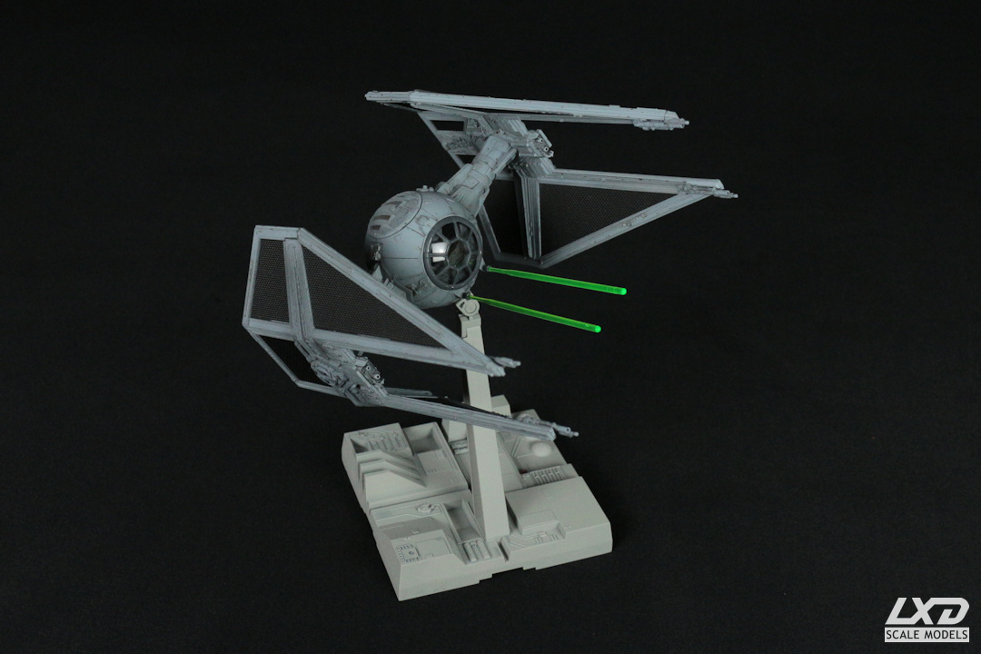 Der imperiale Abfangjäger wurde nach Plan gebaut und mit Acrylfarben airbrushlackiert. Außer einem Pinwash erhielt der TIE nur dezente Alterungsspuren mit dem Pinsel. Beim Bau gab es keinerlei Probleme, die Passgenauigkeit bei diesem Bausatz ist Bandai-typisch hervorragend.