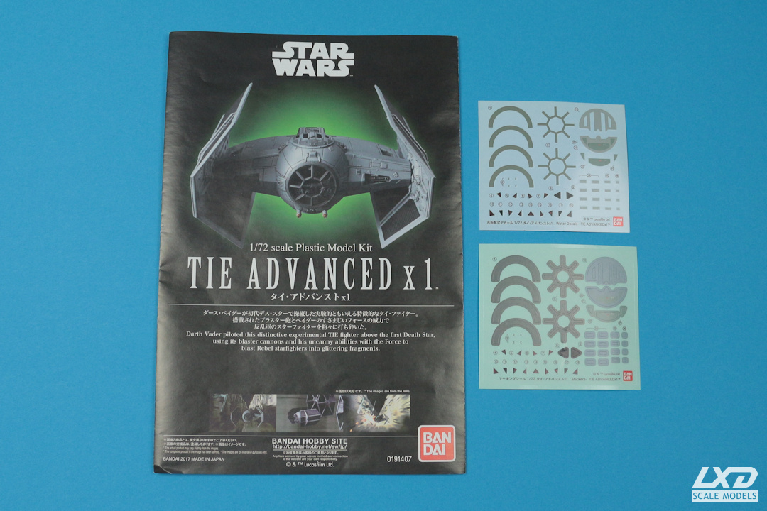 Steckbausatz mit mehrfarbigen Teilen inklusive Ständer. Abziehbilder liegen sowohl als Klebesticker als auch als Nassschiebebilder bei.
