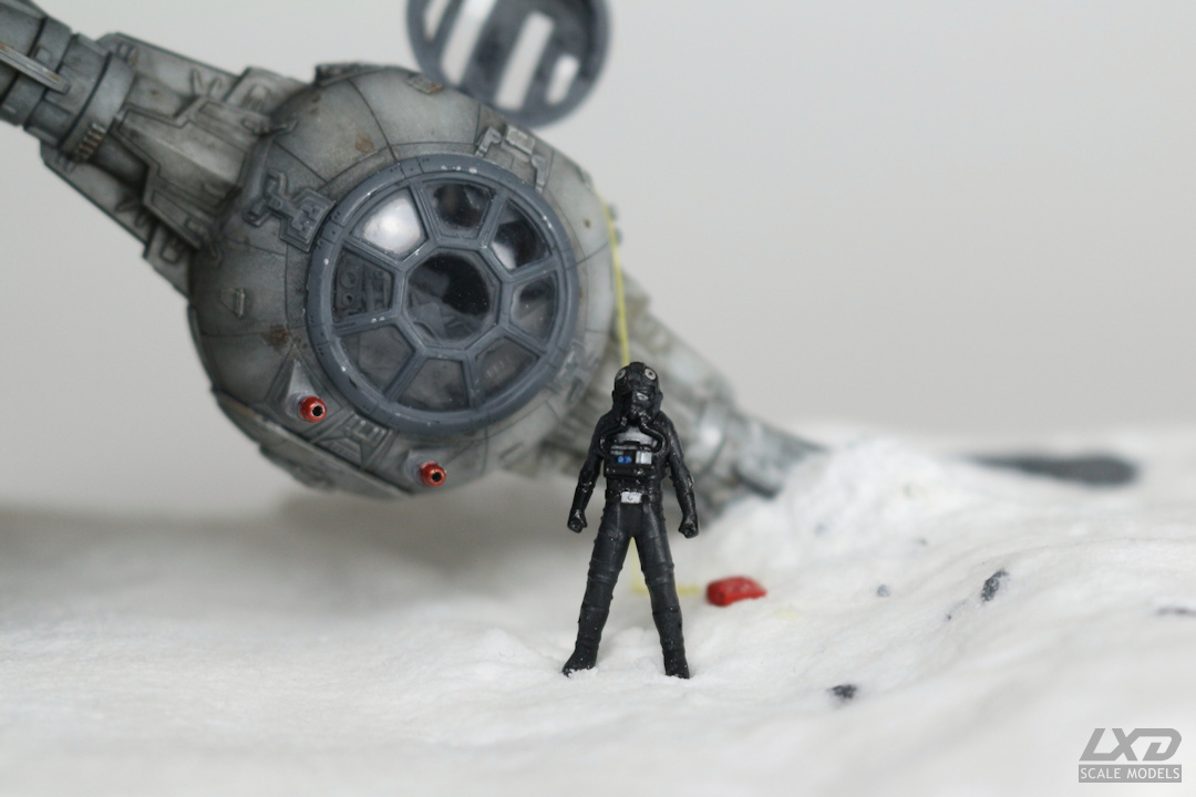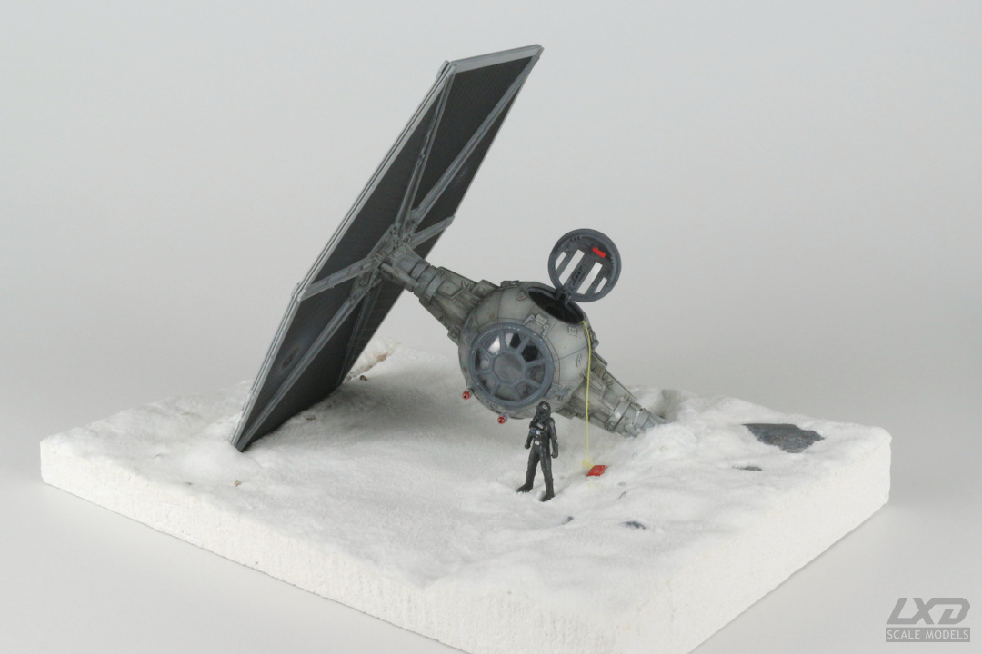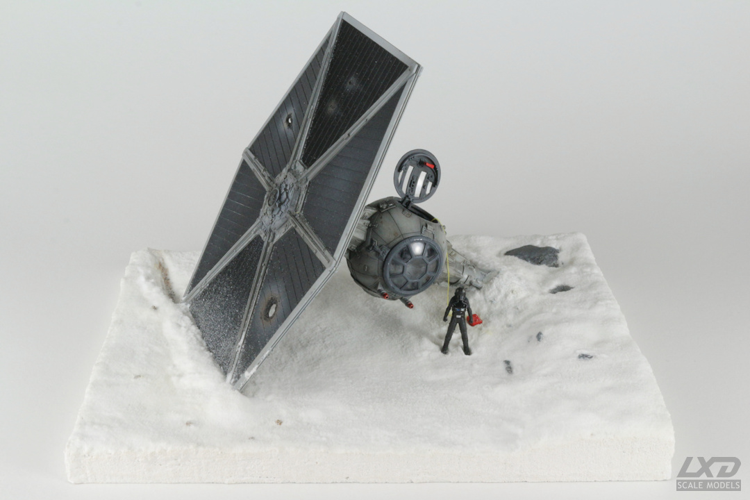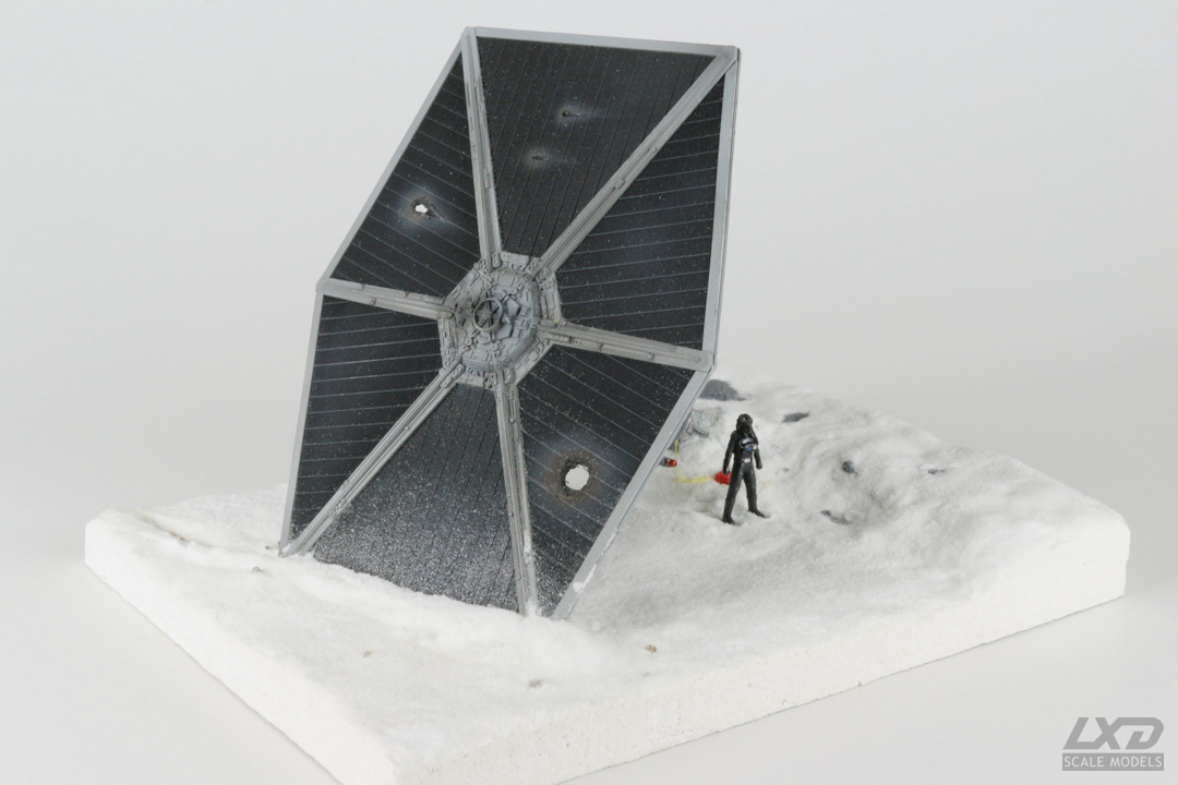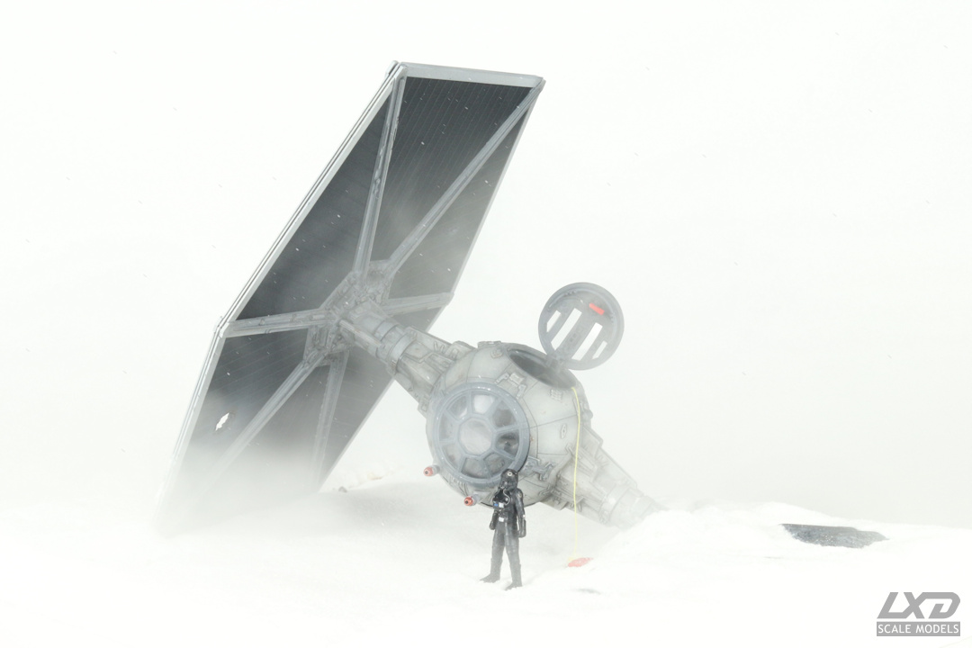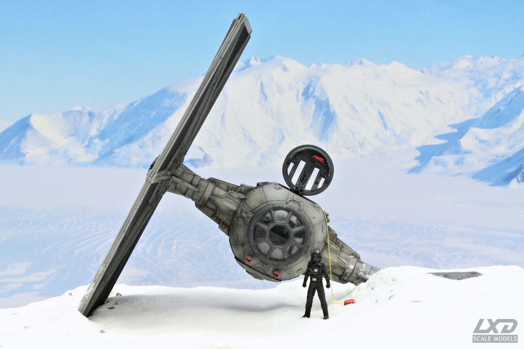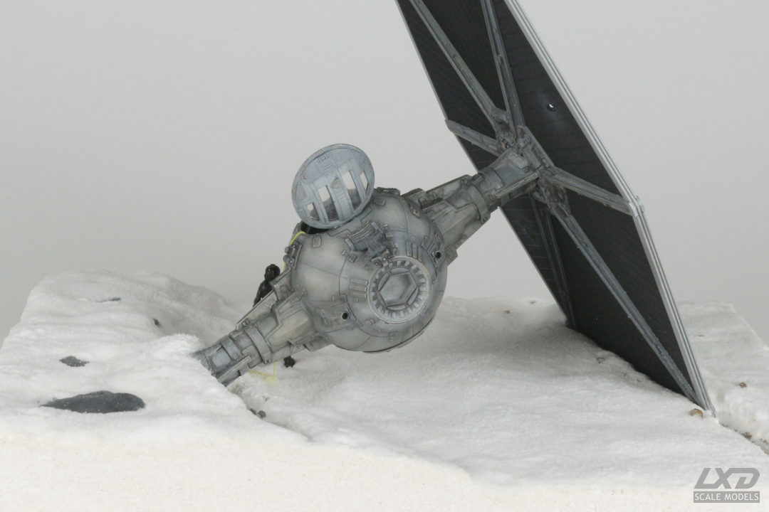 Ein nach heftigem Beschuss abgestürzter TIE Fighter auf einer schneebedeckten Fläche. Der Jäger