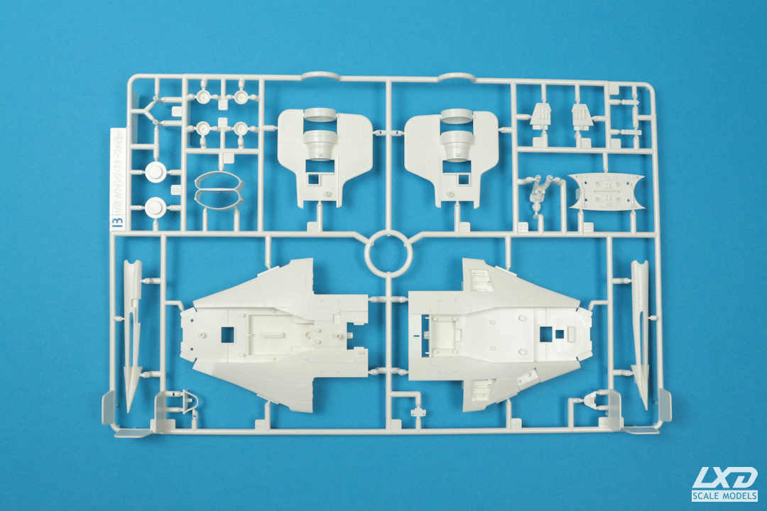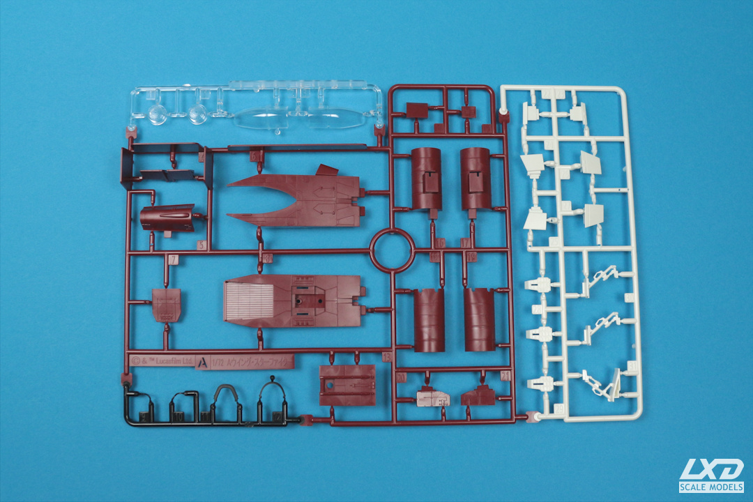 Steckbausatz mit mehrfarbigen Teilen inklusive Ständer. Abziehbilder liegen als selbstklebende Sticker und als Nassschiebebilder bei. Das Modell kann im Flug oder mit ausgeharenen Landebeinen gebaut werden. Inklusive einem Turbolaser-Geschützturm.