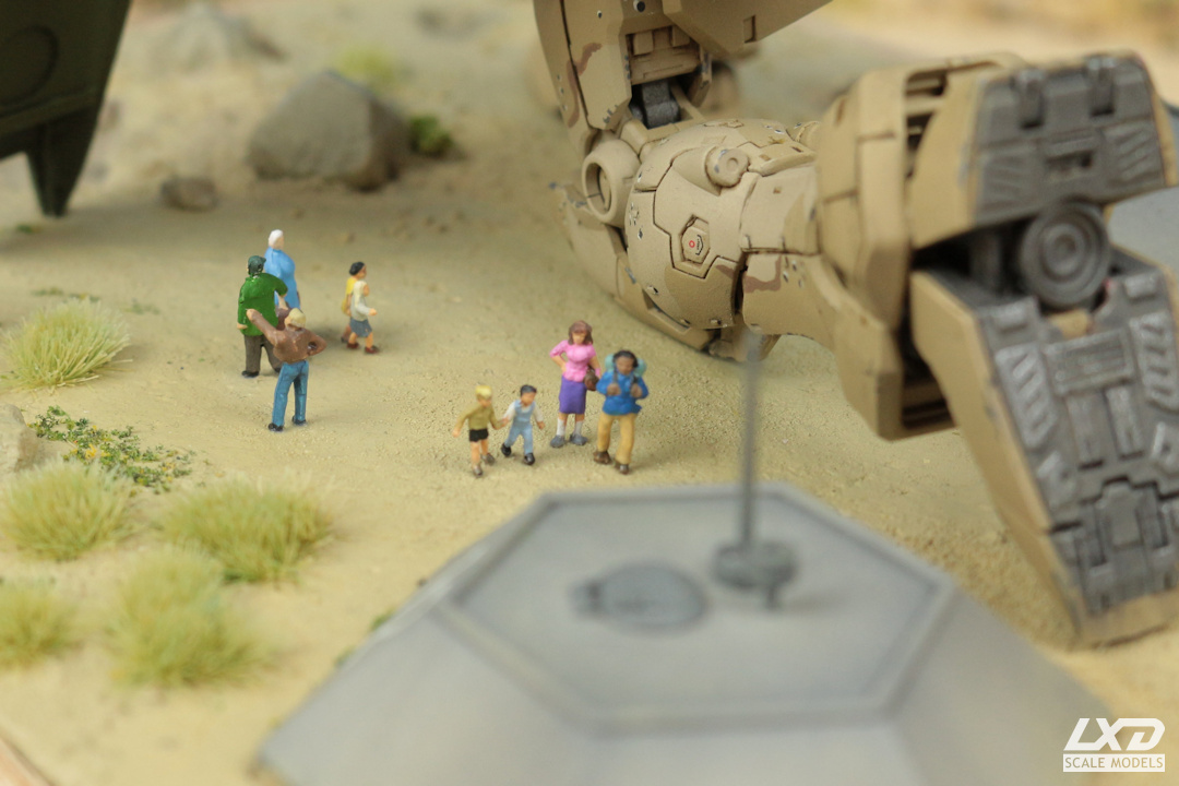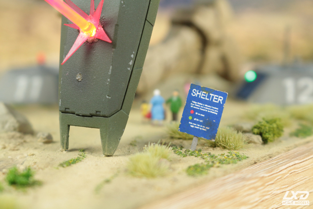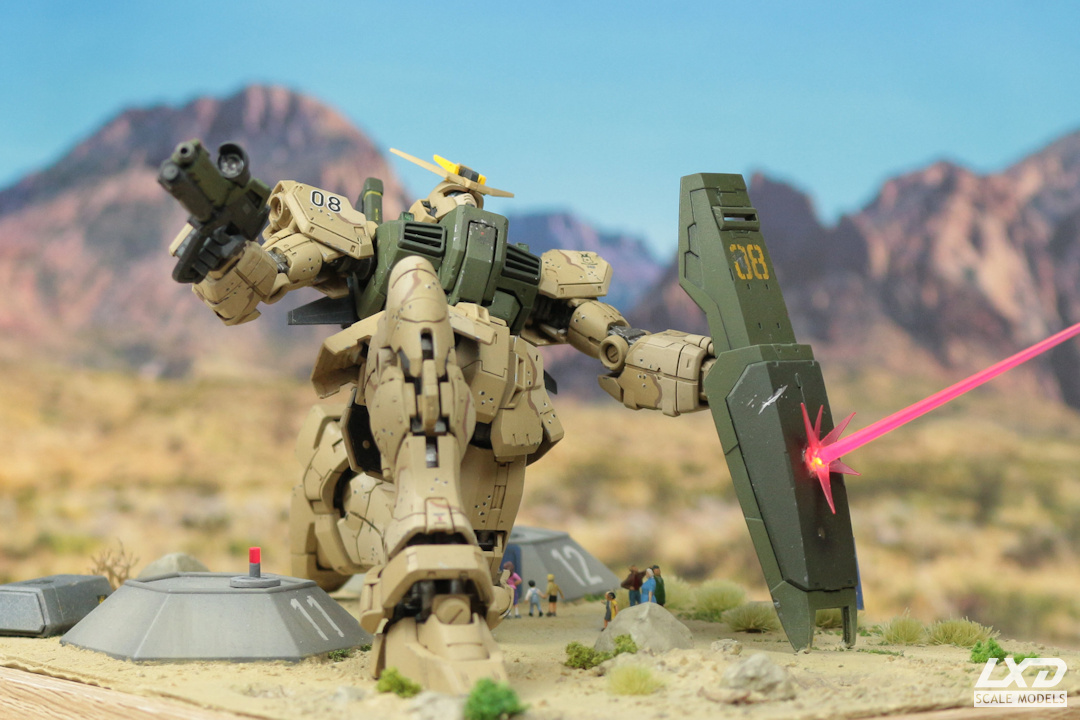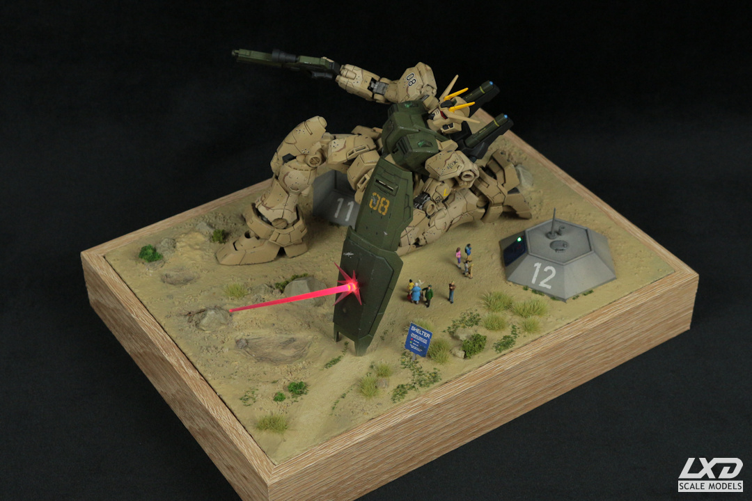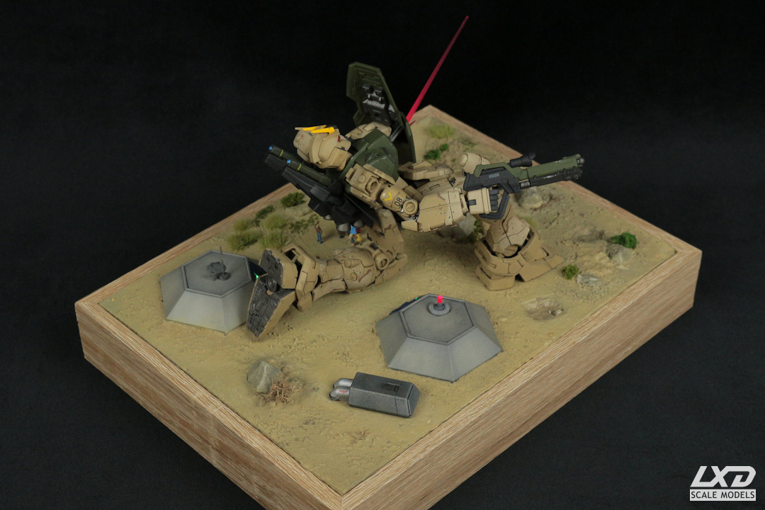 Bei der Bemalung habe ich mich vom traditionellen Erscheiningsbild eines Gundams entfernt und dem Mecha einen Tarnanstrich verpasst. Mit der Körperhaltung sollte die Beweglichkeit dieser Modelle demonstriert werden. Schließlich wurde ein Diorama gebaut, welches Bezug auf den Namen des Gundams - Schildmaid - nimmt. Der Gundam wehrt mit seinem Schild einen Laserschuss eines nicht näher genannten Feindes auf eine Gruppe Zivilisten ab, die dabei ist, Schutz in einem Bunker zu suchen. Ich habe dabei bewusst darauf verzichtet, den Mobile Suit einer bestimmten Fraktion zuzuordnen. Auf wessen Seite Schildmaid kämpft, ist hier völlig unwichtig, der Gundam tritt hier schlicht als Schutzengel (Guardian Angel) der Bevölkerung in Erscheinung.