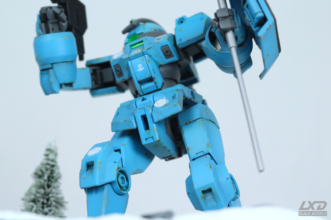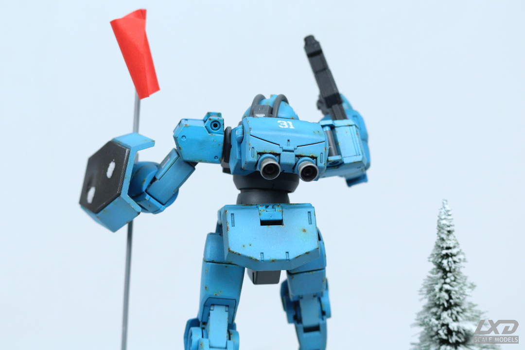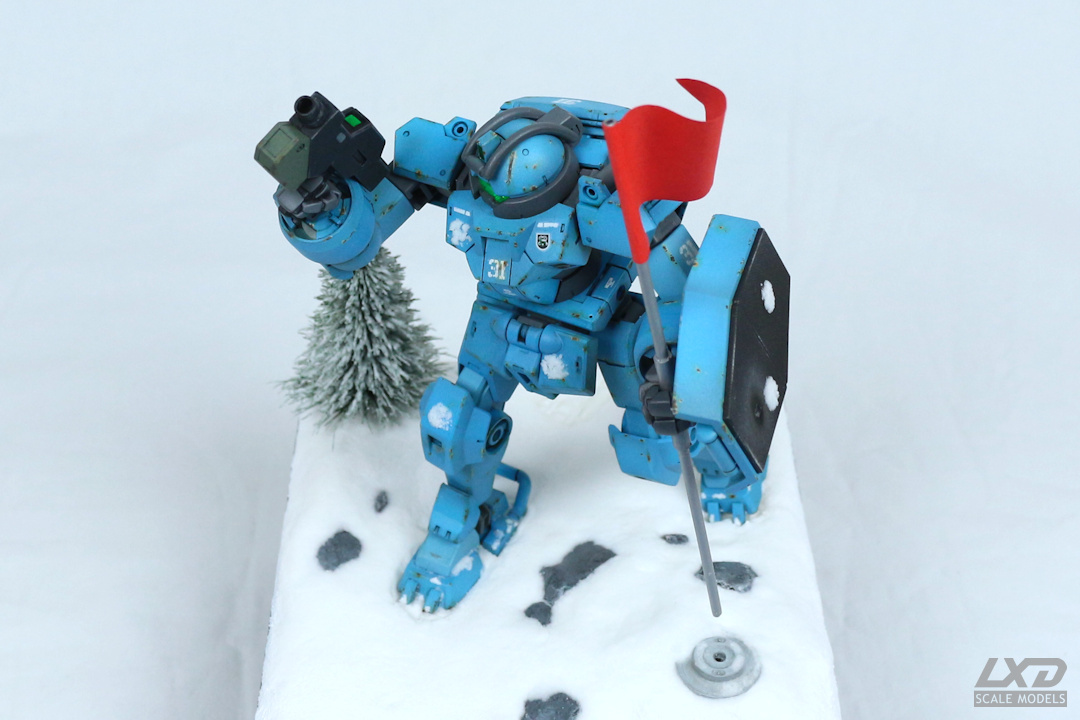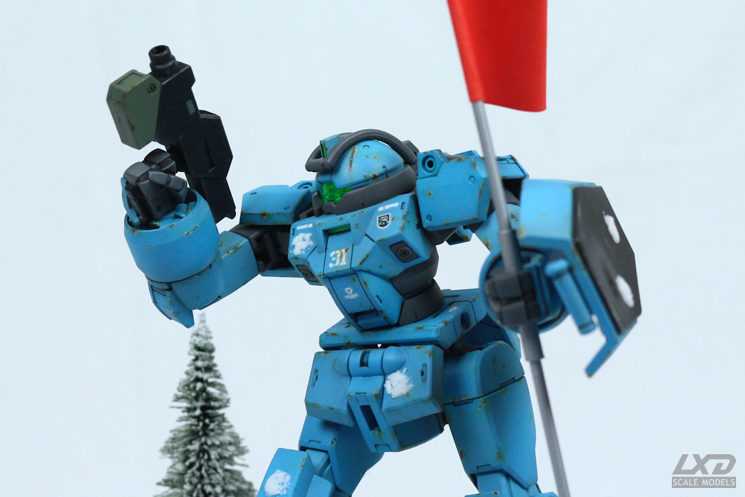 Vor diesem Hintergrund kam mir die Idee, dass man mit Mobile Suits doch auch einmal "Capture the Flag" spielen könnte. Und so setzte ich bei diesem Projekt den Moment in Szene, in dem ein Demi Trainer die gegnerische Flagge erobert. Dass bei dieser Partie in winterlicher Umgebung der Spass nicht zu kurz kam, sieht man an den Schneeball-Treffern, mit denen der Mecha übersäht ist. Offenbar ging der Fahneneroberung eine heftige Schneeballschlacht unter den beteiligten Mobile Suits voraus.