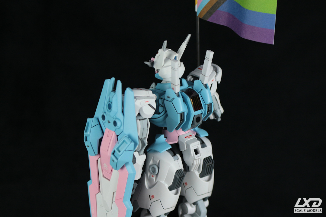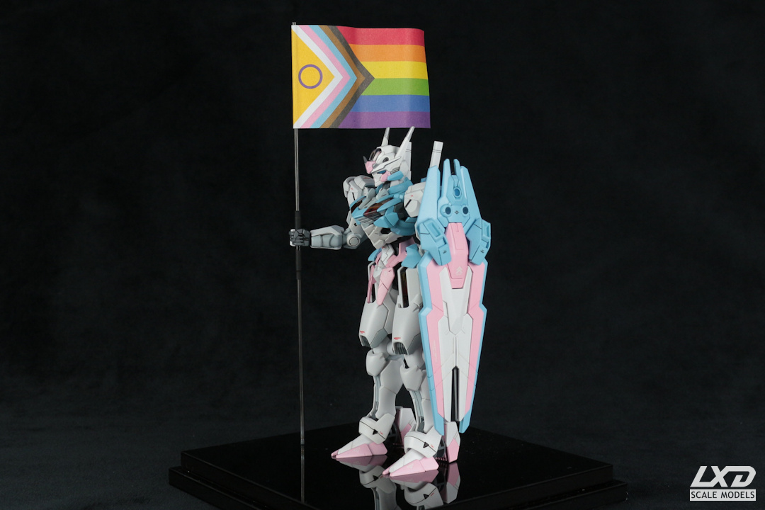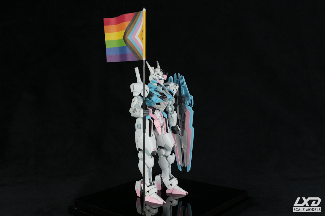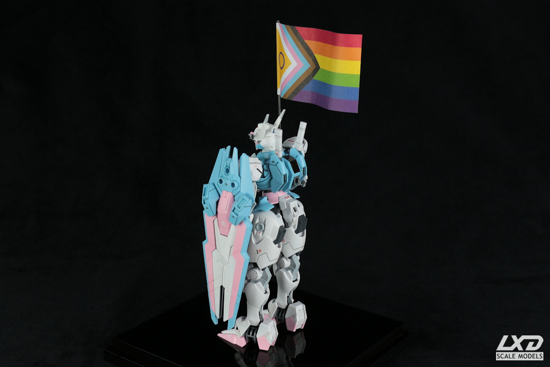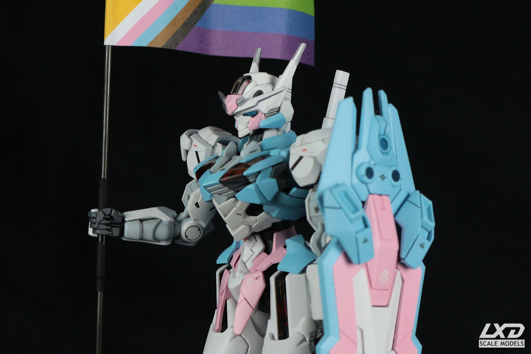 Aerial, Suletta Mercurys Gundam aus "Mobile Suit Gundam: The Witch from Mercury", ist hier in einer ganz besonderen Aufmachung zu sehen. Lackiert in den Transgender-Farben rosa, hellblau und weiß und in der rechten Hand die Pride-Flagge haltend, steht sie als Symbol für die Sichtbarkeit von queeren Menschen. Mit diesem Projekt gedenke ich der Tapferkeit, die es erfordert, offen als nicht-binärer Mensch zu leben. Aerial soll ein kleiner Mutmacher und Unterstützer sein. Deshalb hat sie auch längst einen Platz bei einer anderen Person gefunden, die sie besser gebrauchen kann als ich.