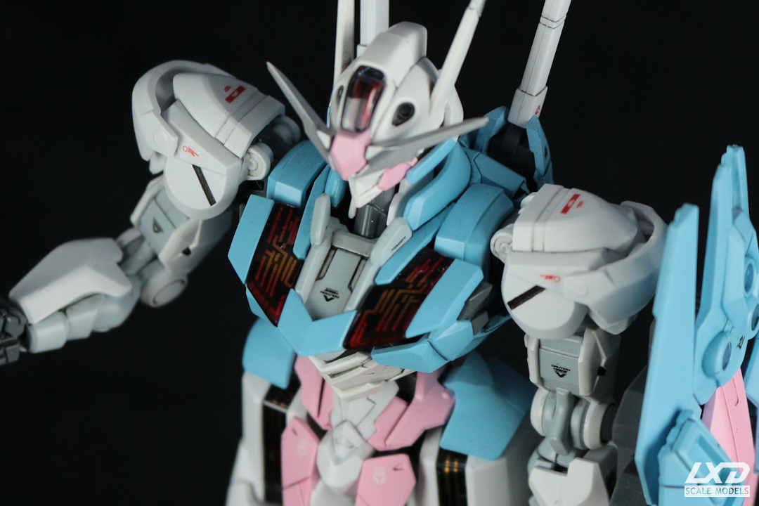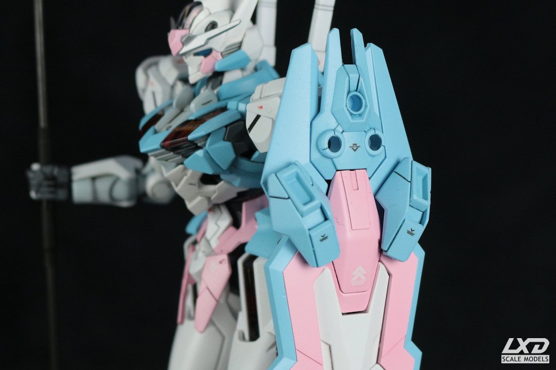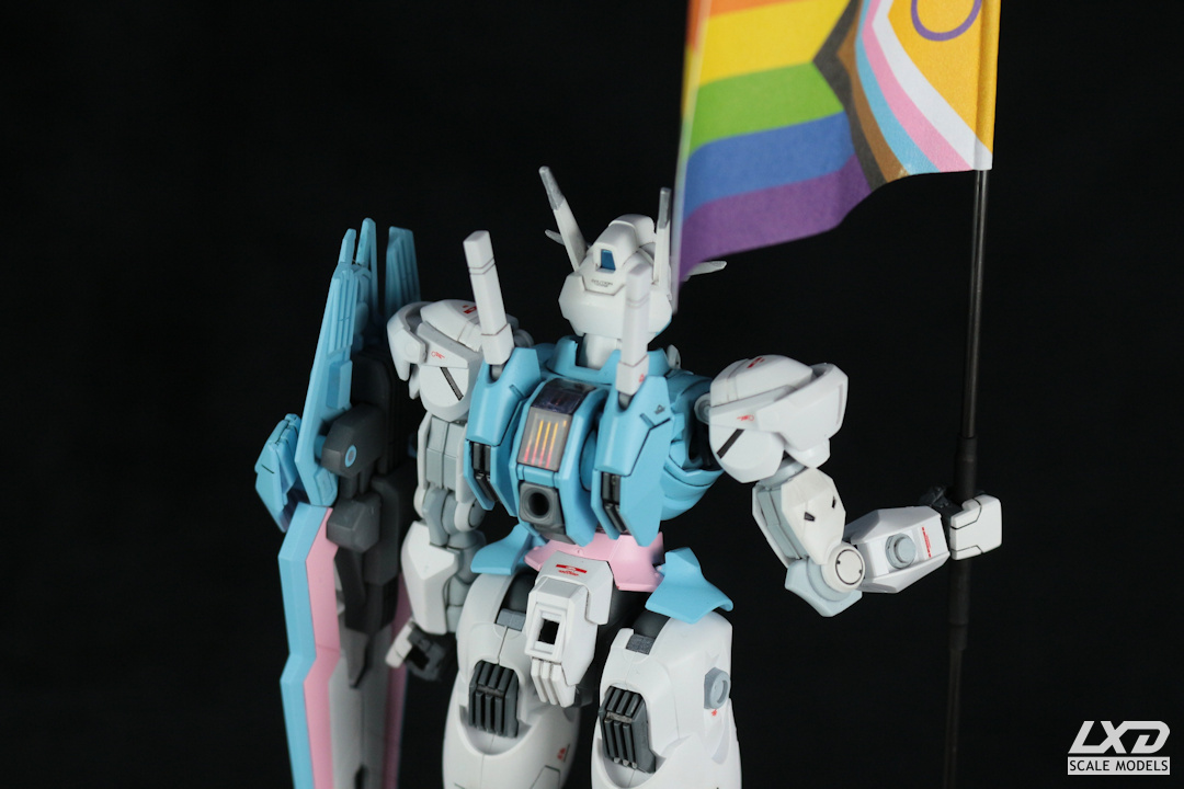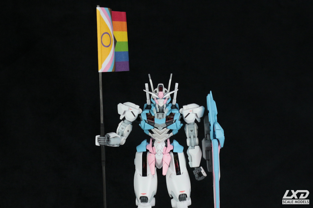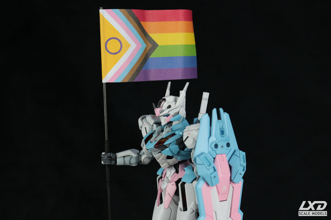 Aerial, Suletta Mercurys Gundam aus "Mobile Suit Gundam: The Witch from Mercury", ist hier in einer ganz besonderen Aufmachung zu sehen. Lackiert in den Transgender-Farben rosa, hellblau und weiß und in der rechten Hand die Pride-Flagge haltend, steht sie als Symbol für die Sichtbarkeit von queeren Menschen. Mit diesem Projekt gedenke ich der Tapferkeit, die es erfordert, offen als nicht-binärer Mensch zu leben. Aerial soll ein kleiner Mutmacher und Unterstützer sein. Deshalb hat sie auch längst einen Platz bei einer anderen Person gefunden, die sie besser gebrauchen kann als ich.
