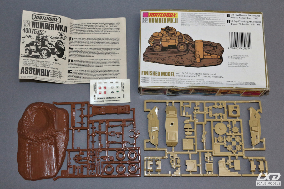 Matchbox brachte ab den frühen 1970ern eine Vielzahl an WKII-Militärfahrzeugen heraus, der Humber-Bausatz stammt von 1973. Das Alter sieht man ihm aber tatsächlich kaum an: die Gußqualität ist durchweg in Ordnung und die Detaillierung ist absolut okay. Lediglich die Decals waren nach all der Zeit spröde geworden und nicht mehr zu gebrauchen. Da ich aber ohnehin eine andere Version bauen wollte und dafür eigene Decals druckte, war das nicht von Relevanz.