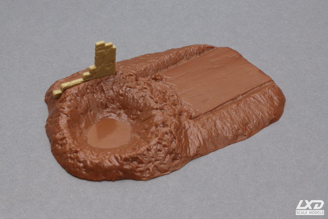 Der Bausatz besteht aus zwei verschiedenfarbigen Spritzlingen. Typisch für die Matchbox Militärfahrzeug-Kits sind die beigefügten Bases, auf denen die Modelle dekorativ präsentiert werden konnten. Hier ist ein Stück zerstörter Straße mit einem Teil einer Gebäuderuine dabei.