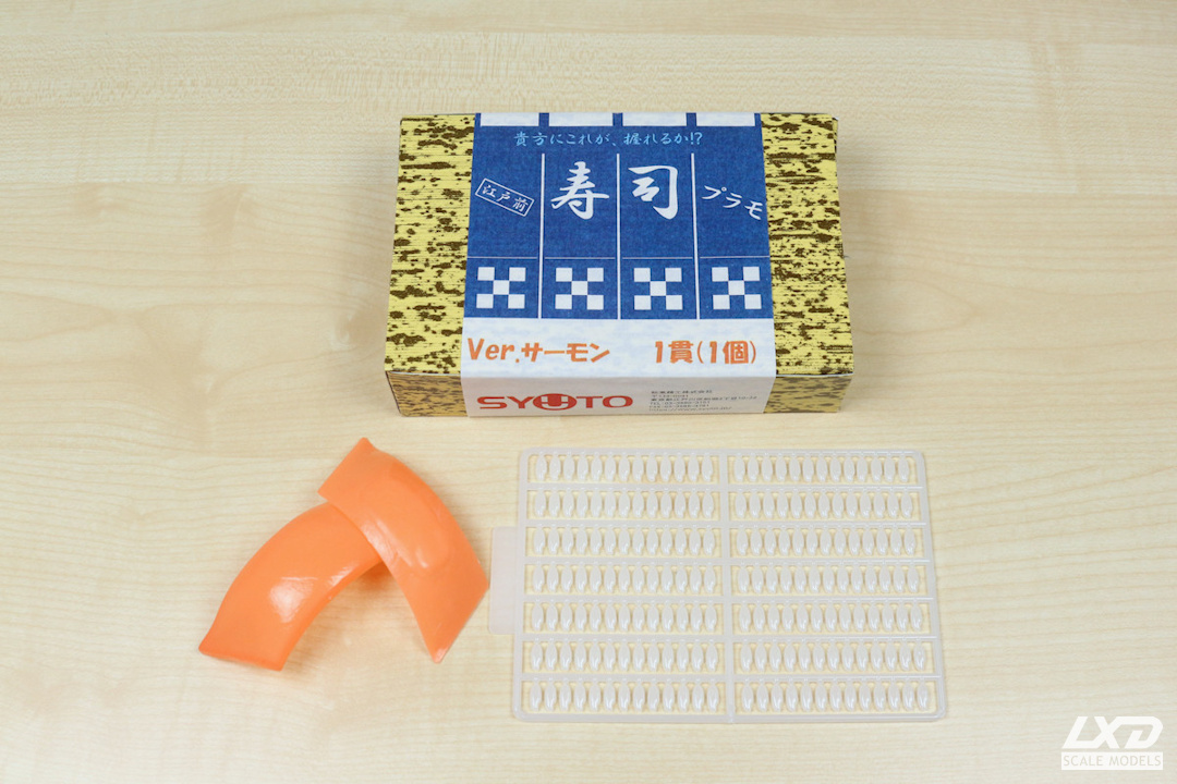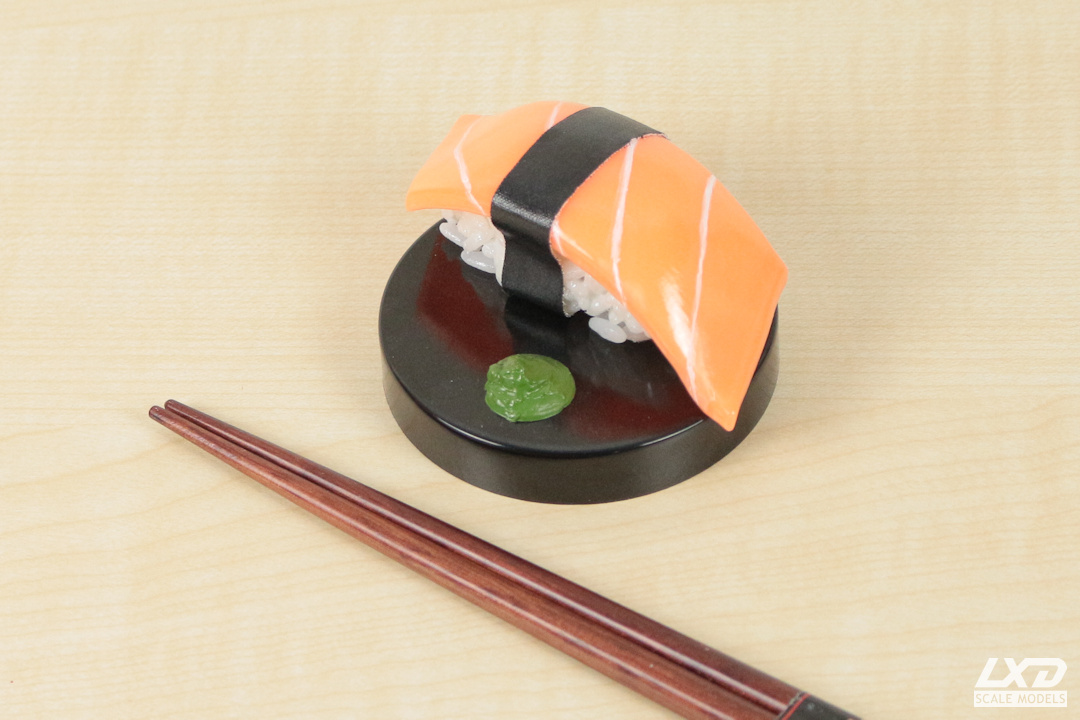 Der Bausatz beinhaltet Teile zum Bau eines Sake Nigiri (Lachs). Weitere Varianten wie Thunfisch Nigiri, Schrimp Nigiri, Kappa Maki (Gurken Rolle) und Tamago Nigiri (Ei) sind ebenfalls erhältlich. Der Bausatz besteht aus Ober- und Unterseite für die Lachs-Scheibe sowie zwei Runnern mit je 91 Reiskörnern. Die Teile sind außerordentlich realistisch wiedergegeben. So hat der Reis die typische, leicht transparente Farbe und der Lachs eine feine, originaltreue Textur.