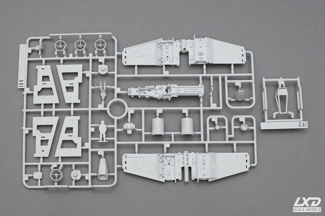 Steckbausatz mit mehrfarbigen Teilen inklusive Ständer mit einer zusätzlichen Sockelplatte, die die Ventilationsöffnung des Todessterns darstellt. Abziehbilder liegen als selbstklebende Sticker und als Nassschiebebilder bei. Das Modell kann entweder mit Cockpitscheiben oder als scheibenloses Studio-Modell gebaut werden, außerdem können die Landebeine ein- oder ausgefahren dargestellt werden.